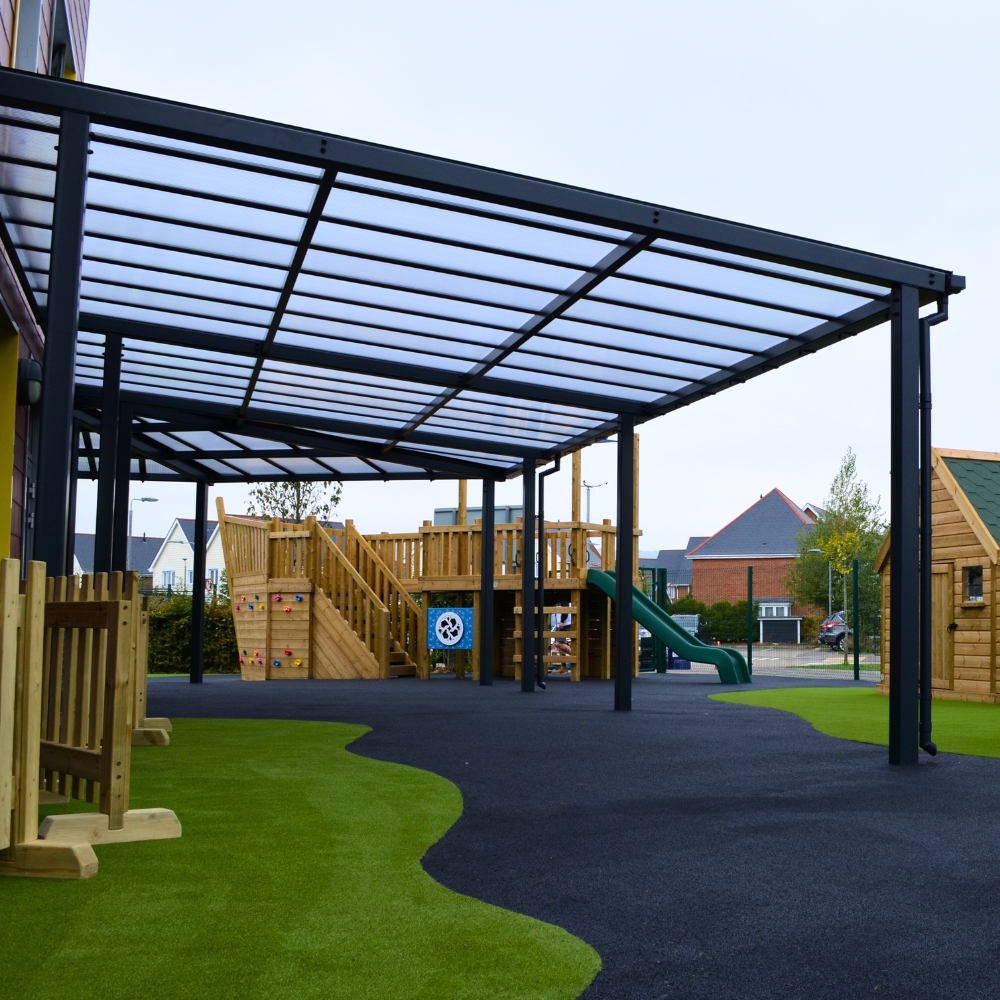 The wall-mounted design allows for efficient use of space, making it perfect for outdoor classrooms, covered play areas, seating zones, or even sheltered walkways. The low-maintenance, weather-resistant materials ensure that the canopy remains durable and functional throughout the year, while its sleek, stylish appearance will complement any outdoor space.